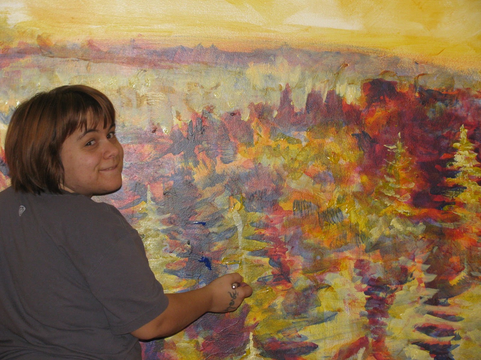 My daughter Ilara's friend Meredith Stults was invited to drop in to help push the Dare to be Different mural over the top on the last day of painting. Which was a good thing, as she dove right in to work on the deep dark shadows in the old-growth forest. Meredith clearly enjoyed herself, as was evidenced by her great, relaxed brush-strokes. Working on a large-scale mural (albeit this is one of the smaller ones; though the same general rules apply) it is critical to keep the flow of the brush-work loose and fluent. Too much 'pickyness' or tightness tends to dampen the free flow of painting on this scale, so I always encourage my proteges to stay loose, keep breathing and to go with the flow of the piece...to be 'in the moment'.